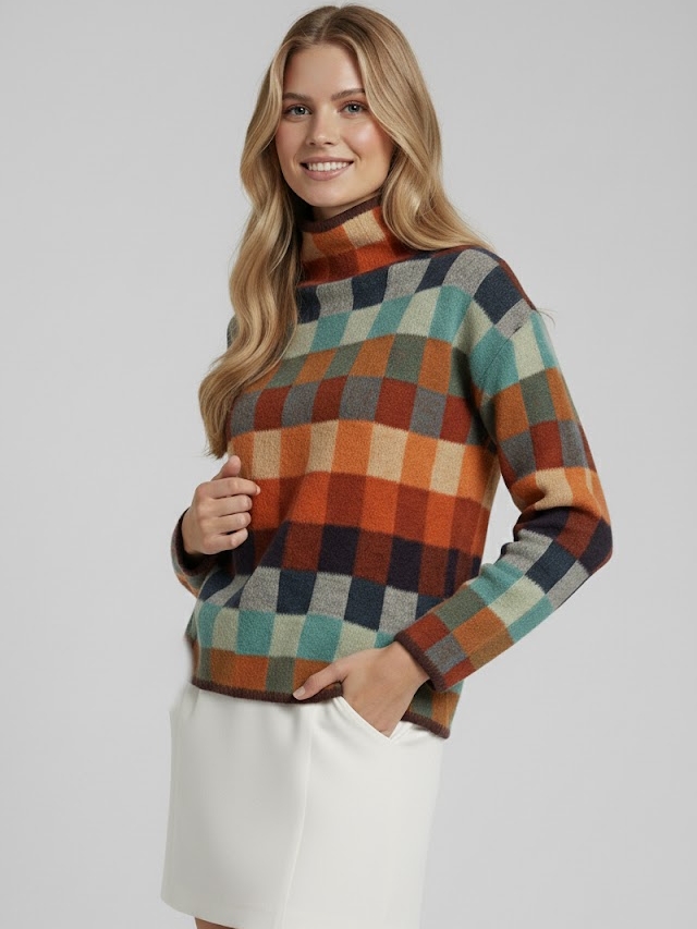 Colorful Checkered Pattern Knit Pullover with High Collar