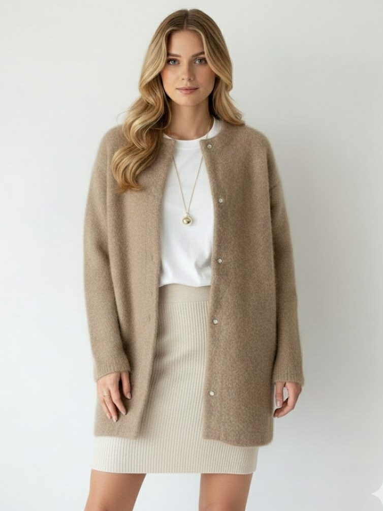Long Round Neck Knit Cardigan with Pearl Buttons