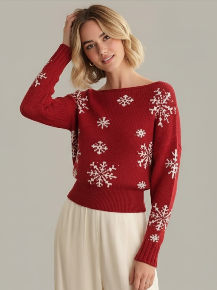 Snowflake Jacquard Pullover Sweater – Off-Shoulder Boat Neck Long Sleeve