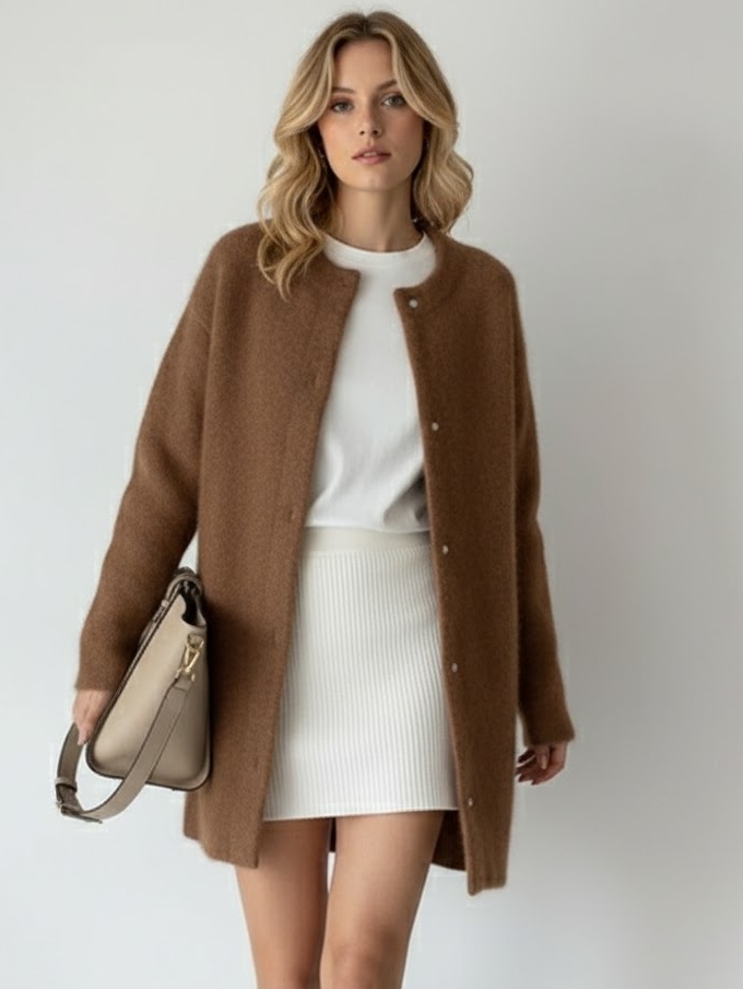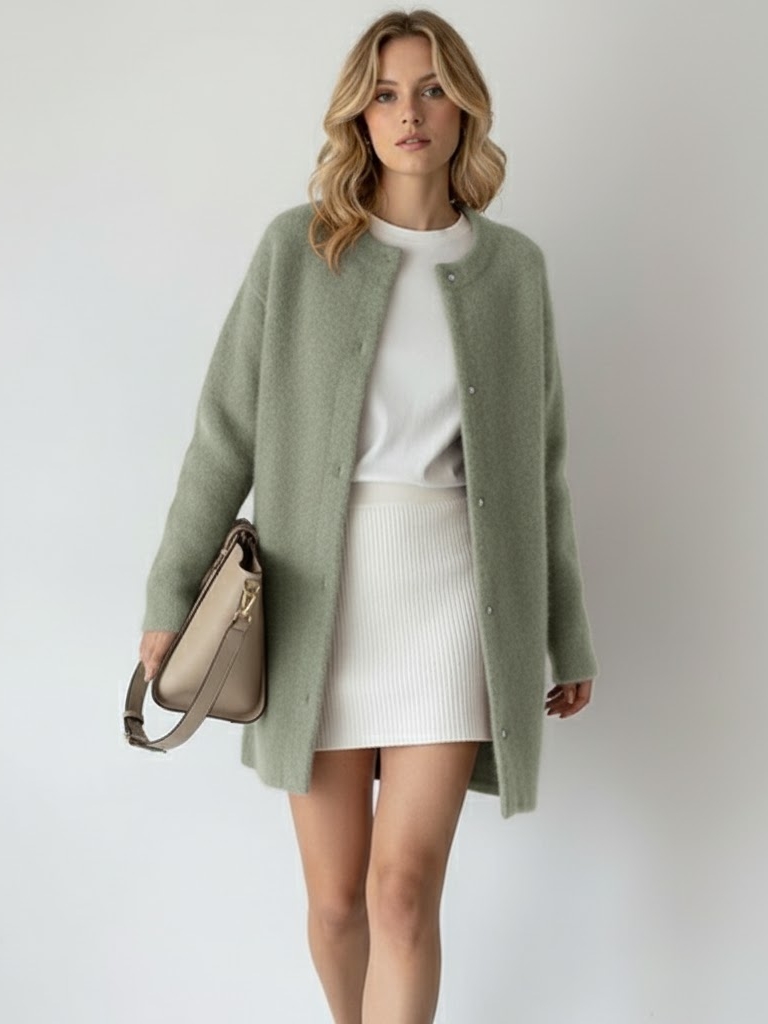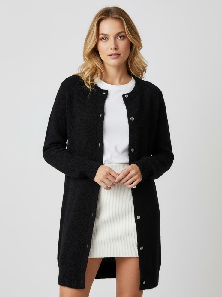 Long Round Neck Knit Cardigan with Pearl Buttons