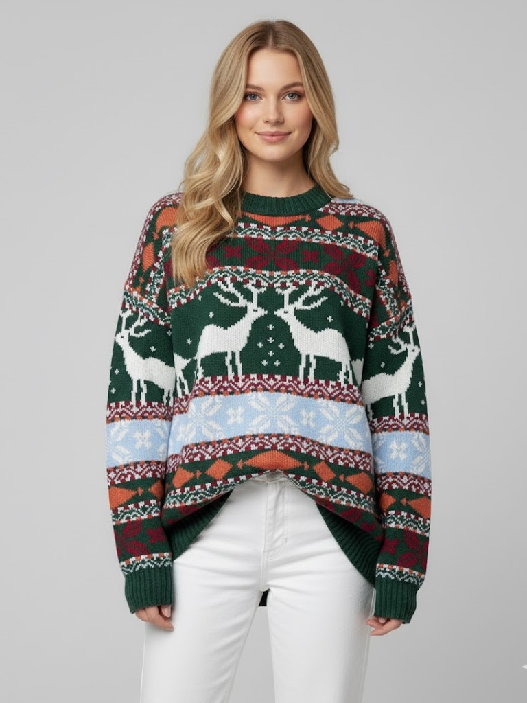 Elegant Christmas Reindeer Pattern Knit Sweater – Long Sleeve Round Neck Pullover